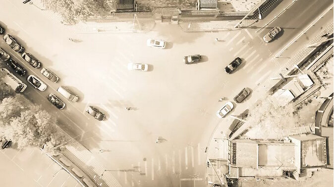 - An aerial view of traffic around the drum tower