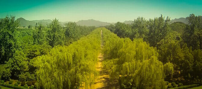 - Rows of willows lead out to the mountains