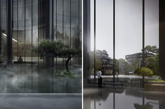 “The design,” explained Ma in a statement, “starts with the understanding that the park is part of the plot: by taking the natural beauty of lakes and mountains, the architectural complex can be read as a futuristic city landscape painting in which high-rise buildings act as the peaks, individual office buildings as the slope, high-end offices as the ridge and residential buildings as mountain ranges in combination with classical landscape elements like lakes, springs, forest, streams, valleys, rocks and peaks.”