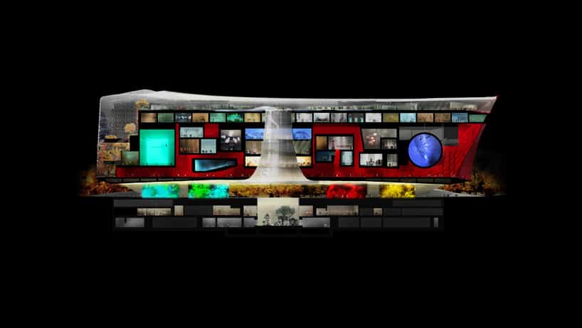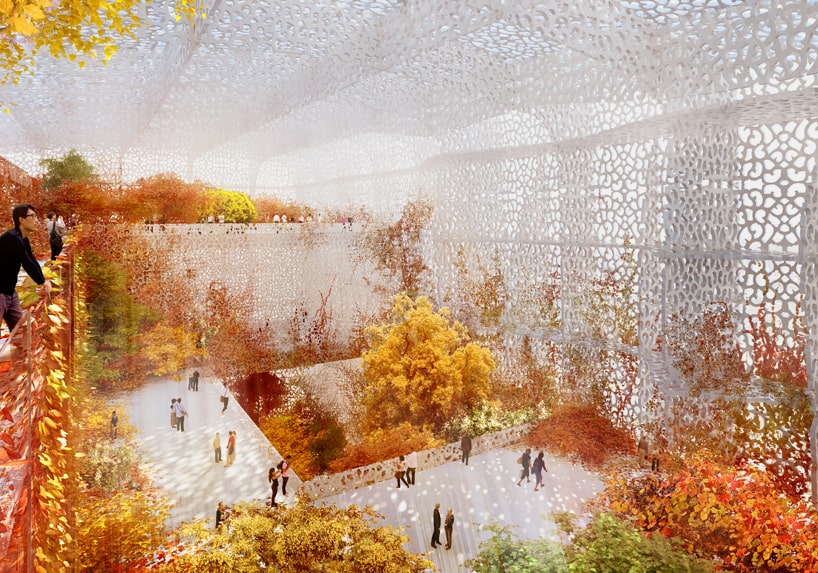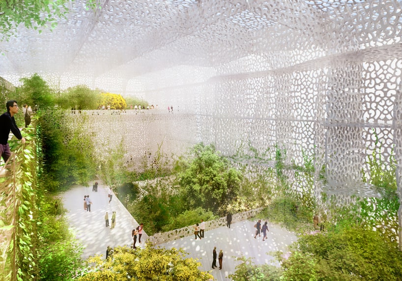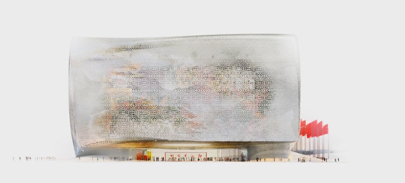 Nouvel’s design for the National Museum of China (NAMOC) features a finely perforated facade wrapping the exterior of the building, which allows sunlight to filter in, and supports a six-storey indoor garden.