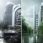 The site is composed of six zones, two of which are linked by a vertical public plaza. Curving pathways weave through the commercial complexes, which provide access from the busy ground level to the elevated park, where citizens can wander between buildings and gardens.