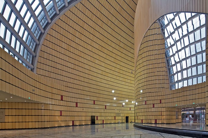 Andreu, who also designed the Pudong International Airport, as well as the National Grand Theater in Bejing, conceived the theater as a set of three independent shells, housing an opera hall, a concert hall and a multifunctional area respectively.