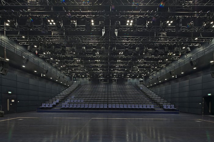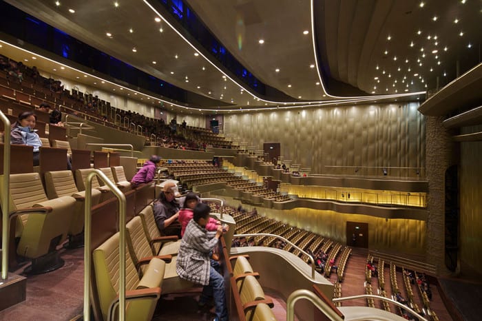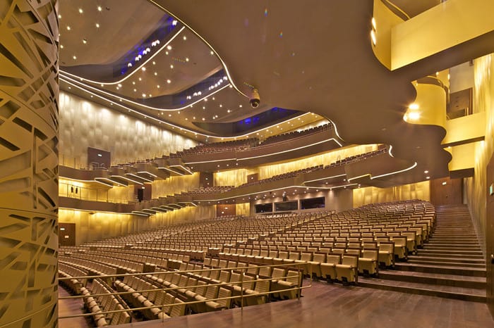 Guests enter the Grand Theater through a sequence of spaces that offer access to each of the audience halls, with the cuboid opera hall incorporating balconies oriented towards the stage.