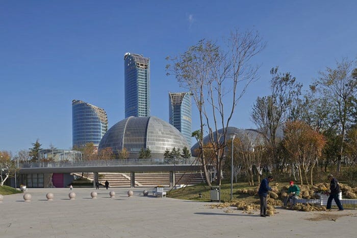The theater complex is part of a masterplanned development designed around a park connecting the residential and commercial parts of the project with the cultural centre. In addition to the Grand Theater, the development will include three towers which will be home to a hotel, apartments, and office space built to correspond with the three shells of the theater.