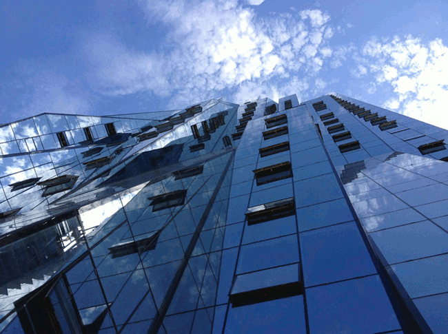 The waves of glass panels that make up the 50,000 square metre office building’s exterior reflect the sky and surrounding buildings during the day., and at night, the building lights up like a giant equaliser.