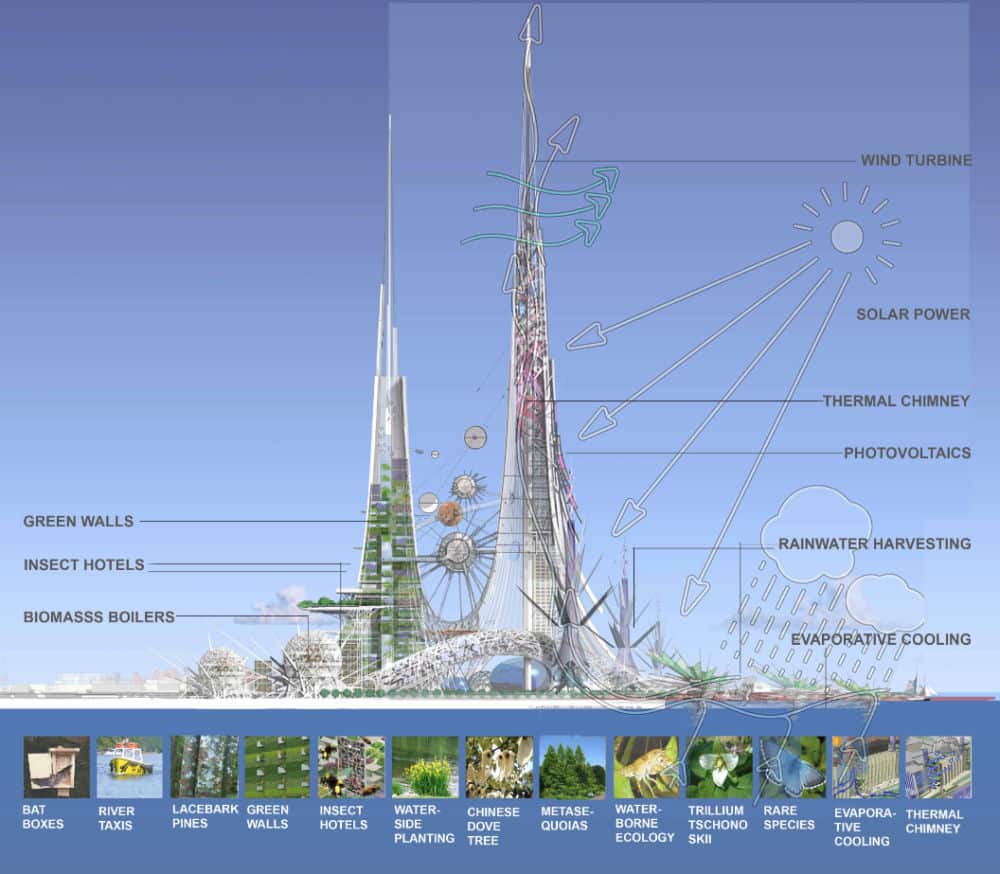 Where Sky City was going to wow us with its speed of construction (the as yet unfinished 220-storey building was originally predicted to take only 270 days to complete), the Phoenix Towers promise an array of environmental features not yet seen in any large scale structures, including biomass boilers and insect hotels.
