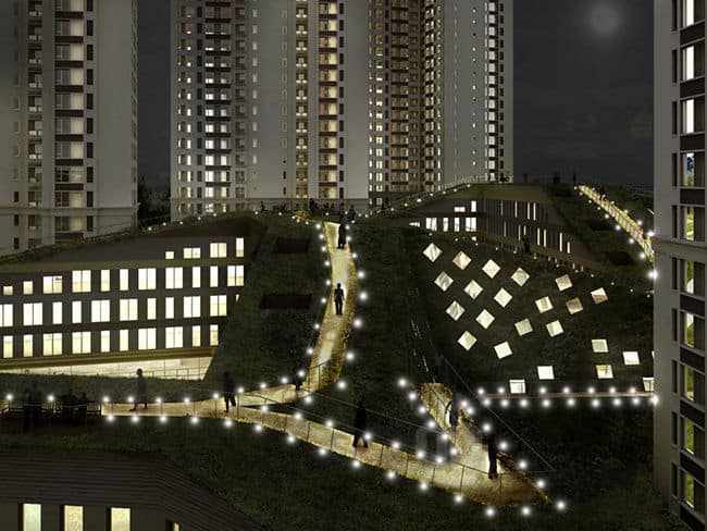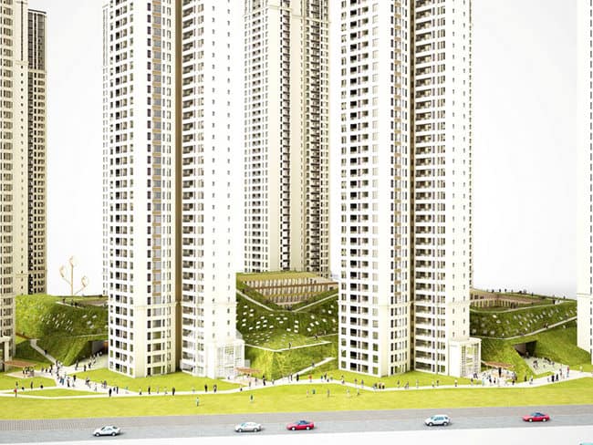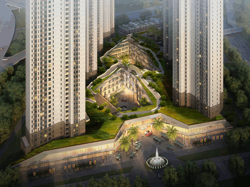 The valley effect of the combined retail and SOHO area is enhanced in the design by landscaping that covers the entire development, including a green hill that forms a natural base for the towers. An accessible green roof will extend the landscape and reinforce the natural impression.