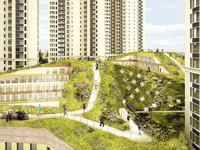 - Winding circulation on top of green roof