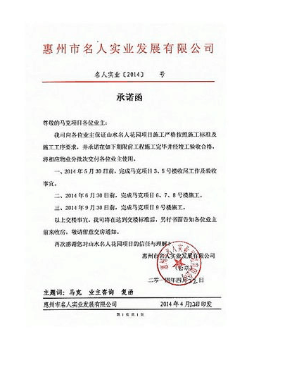 Guang Group said that it had produced a new schedule for existing buyers of homes in its Huizhou project, informing them of the revised completion date, and had made provisions for compensating its customers for the delay.