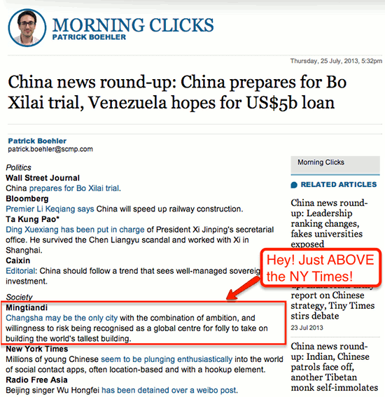 My story this week on the Sky City project in Changsha was picked up in the newspaper’s Morning Clicks news round up. We even got listed above a few other slightly more famous news organisations.
