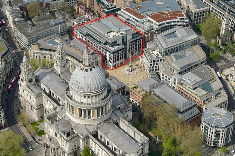 Paternoster Square with Warwick Court outlined in red and St Paul’s Cathedral at lower left (Image: Daibiru)
