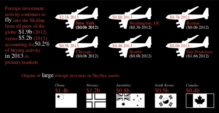 Major acquisitions of landmark properties by investors such as Zhang Xin of Soho China and investment conglomerate Fosun made China lead all foreign countries as an investor into US trophy buildings with $1.4 billion in deals, while oil-rich Norway came in second place with $1.2 billion in deals, according to JLL’s Spring 2014 U.S. Skyline Review.